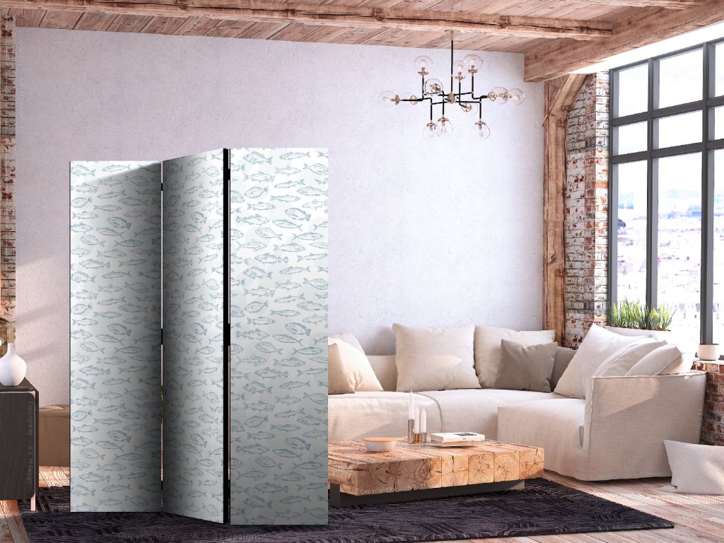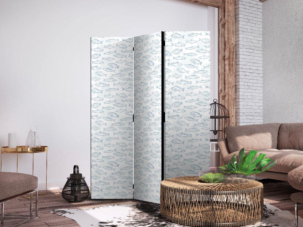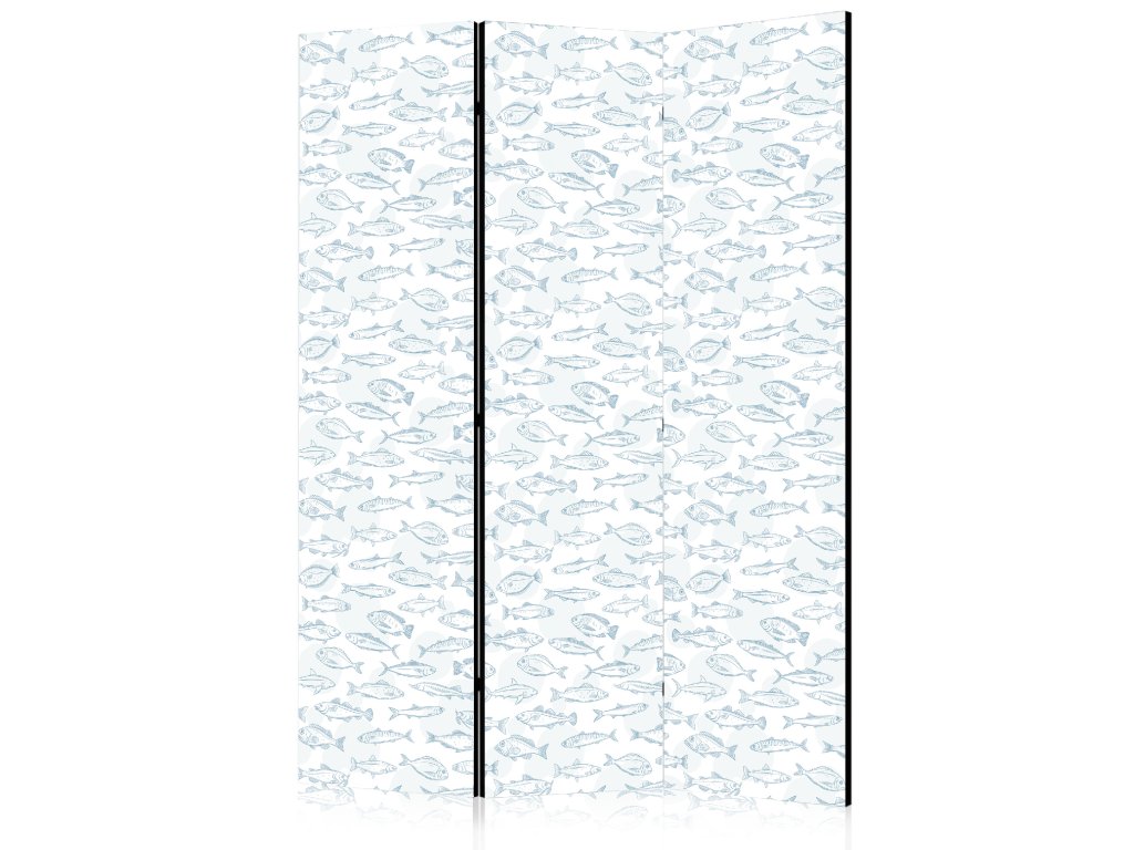 Paraván - modrá ryba - modré obrysy různých druhů ryb na bílo-modrém pozadí