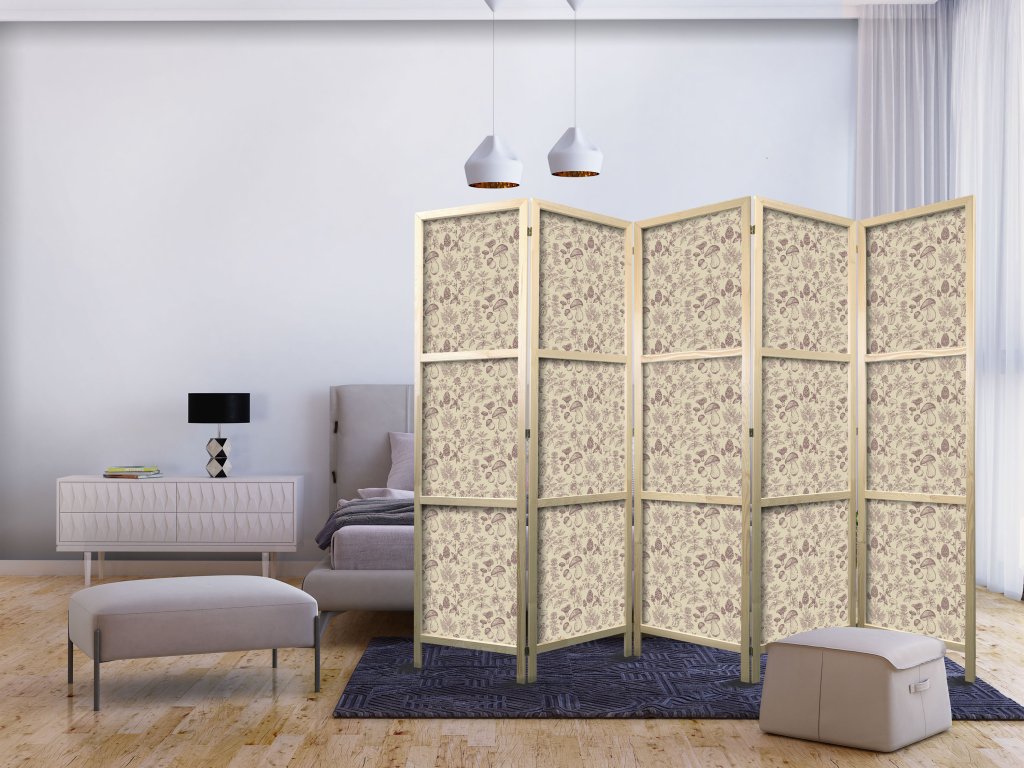 Japonský paraván - Béžová příroda lesa: Houby, květiny a bylinky na světlém pozadí