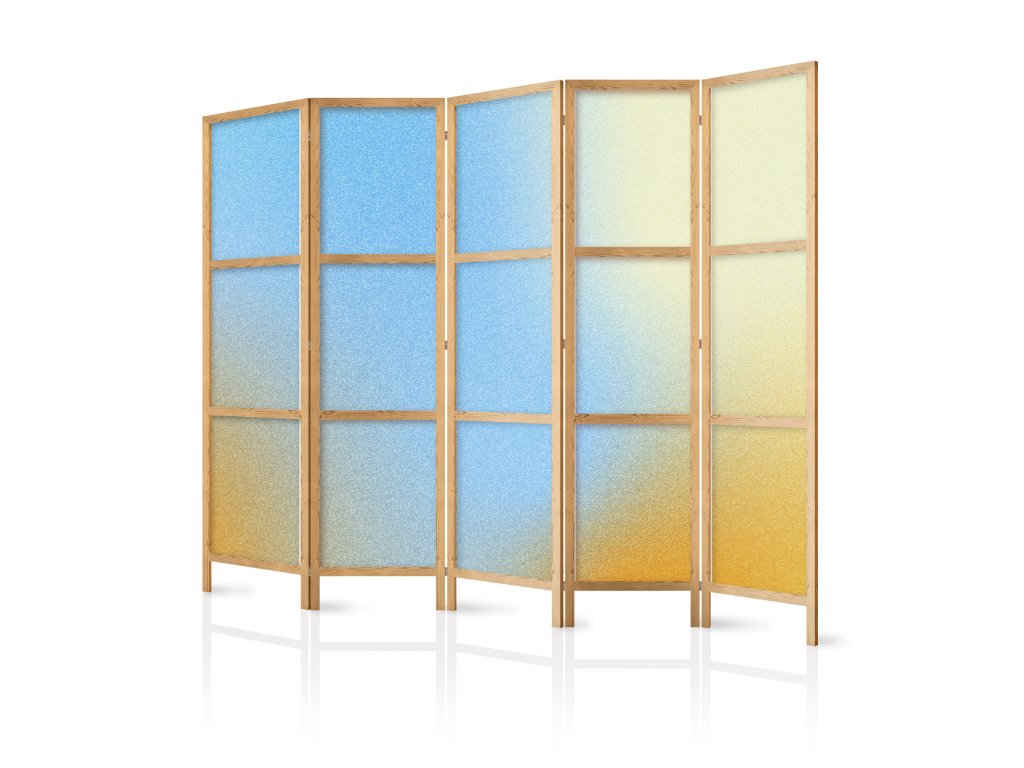 Japonský paraván Energetický Gradient přinese do vašeho interiéru svěžest a moderní styl díky plynulému přechodu barev od modré po zlatou!