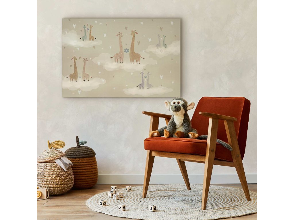 Obraz - Láska - Barevné žirafy plovoucí na oblacích mezi srdíčky a hvězdami